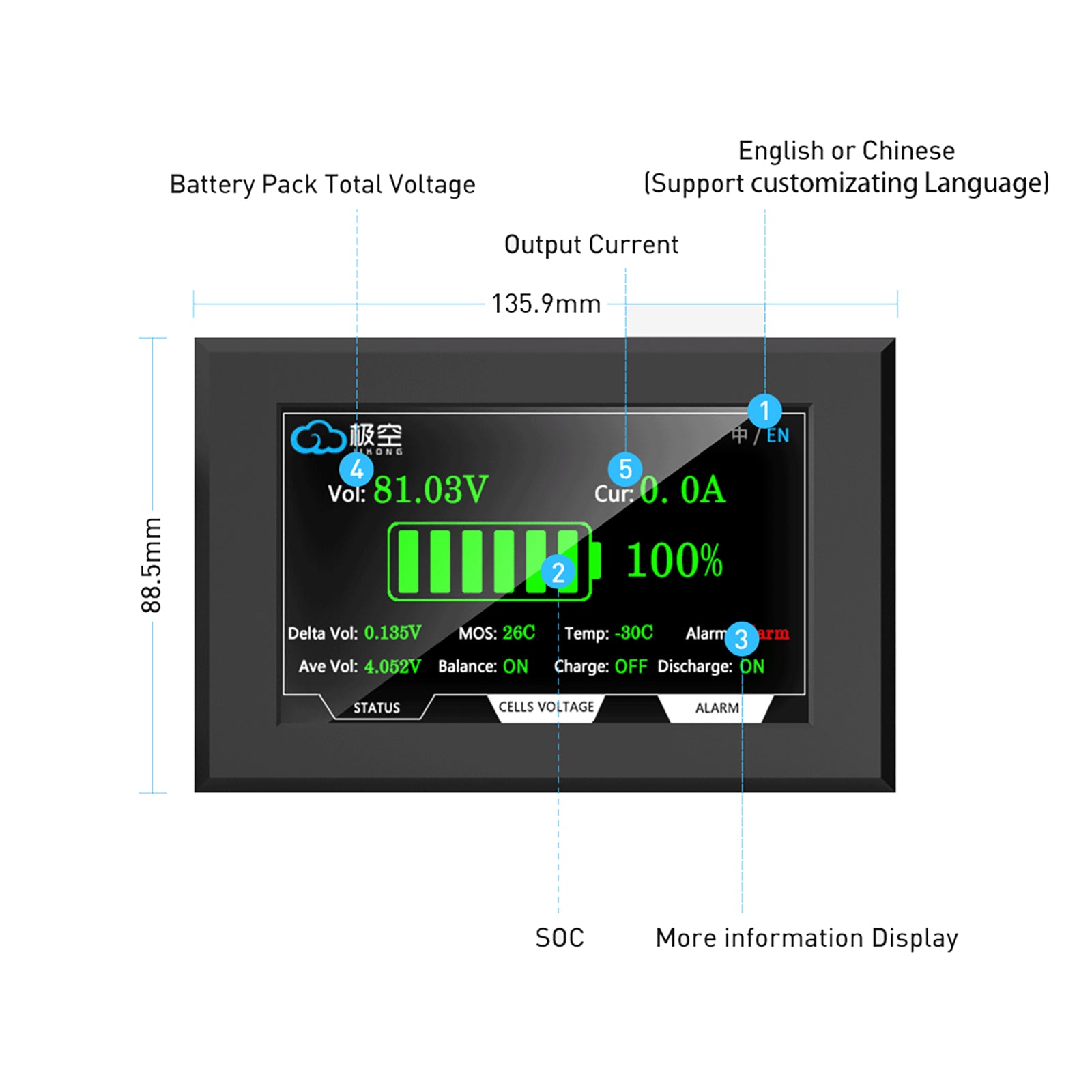 Display content: Battery pack voltage, Current, SOC, Individual cell voltage, Temperature, etc.