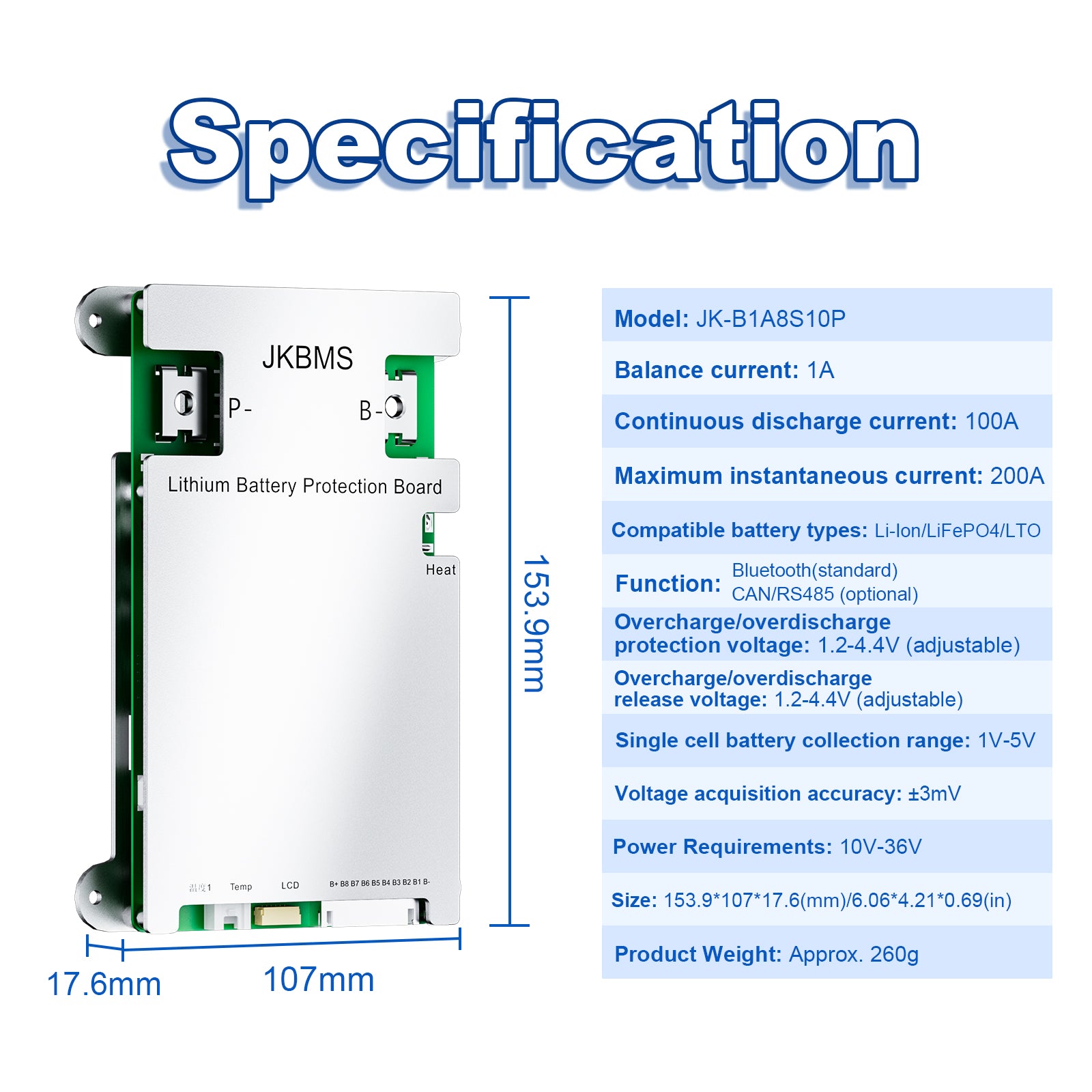 JKBMS Smart BMS 4S-8S 100A 1A Active Balance Built-in Bluetooth with CAN RS485 PCB Battery Protection Board for LiFePO4 Li-ion LTO Battery Pack (JK-B1A8S10P)