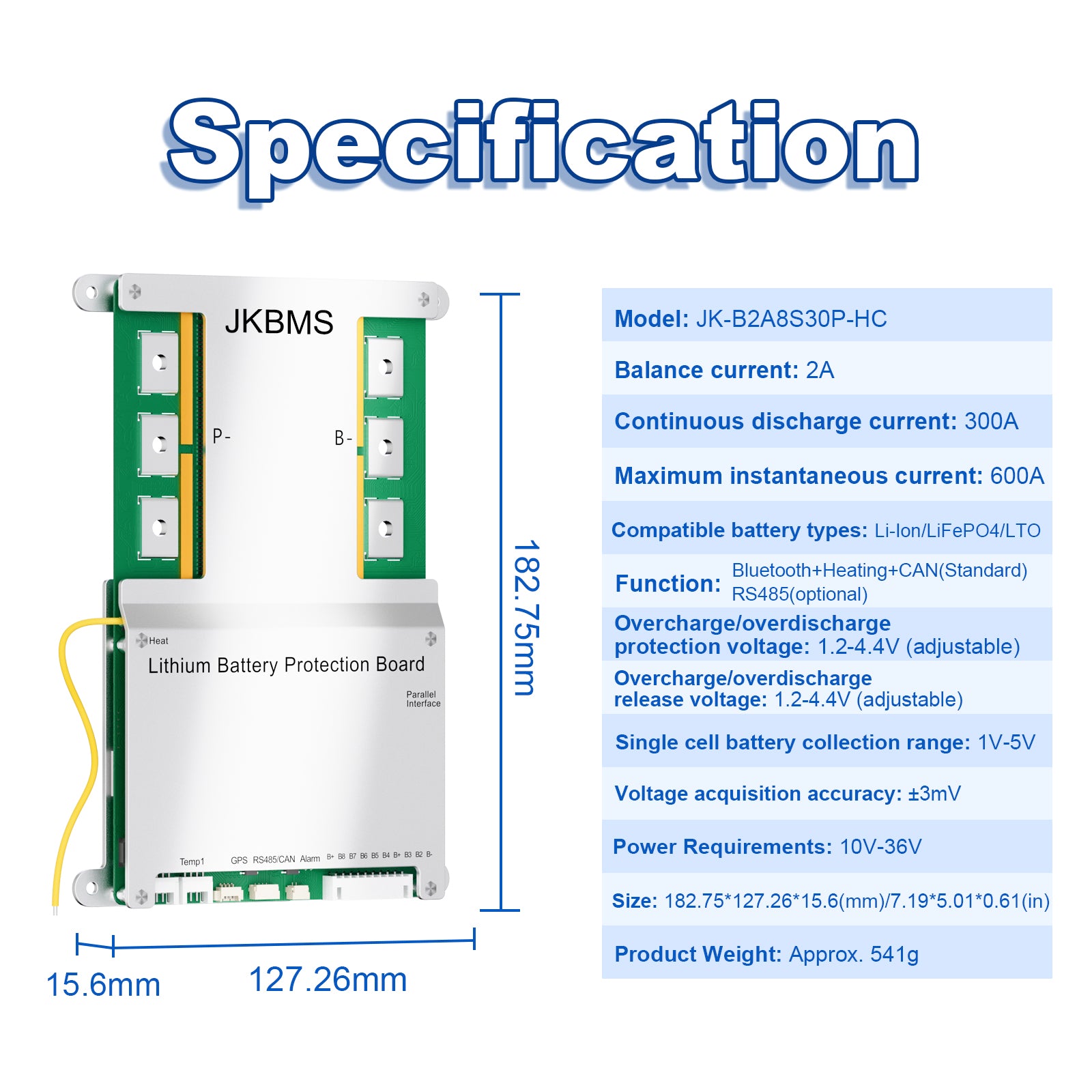 JKBMS Smart BMS 4S-8S 12V-24V 300A 2A Active Balance Build-in Bluetooth with Heat CAN RS485 PCB Battery Protection Board for LiFePO4 Li-ion LTO Battery Pack (JK-B2A8S30P-HC)