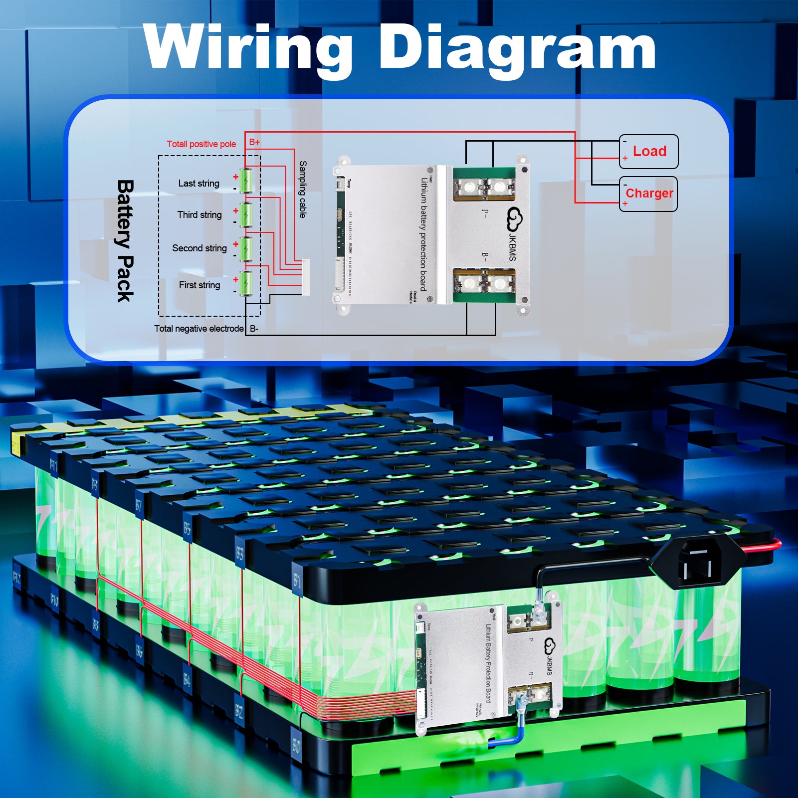 JK BMS continuously monitors battery conditions to ensure safe and stable operation. The system provides multiple protection functions including: