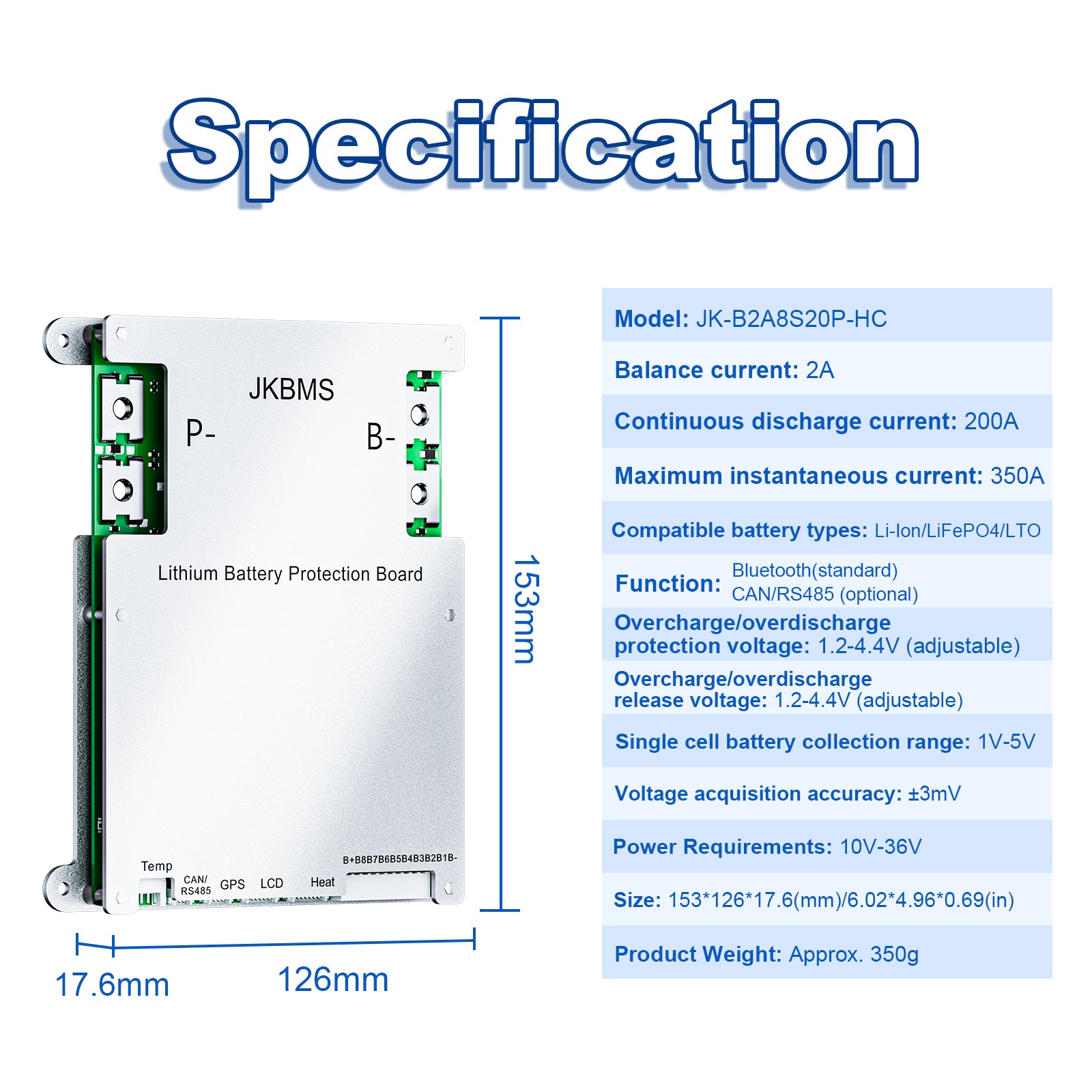 JKBMS Smart BMS 4S-8S 200A 2A Active Balance Built-in Bluetooth with RS485 PCB Battery Protection Board for LiFePO4 Li-ion LTO Battery Pack(JK-B2A8S20P)