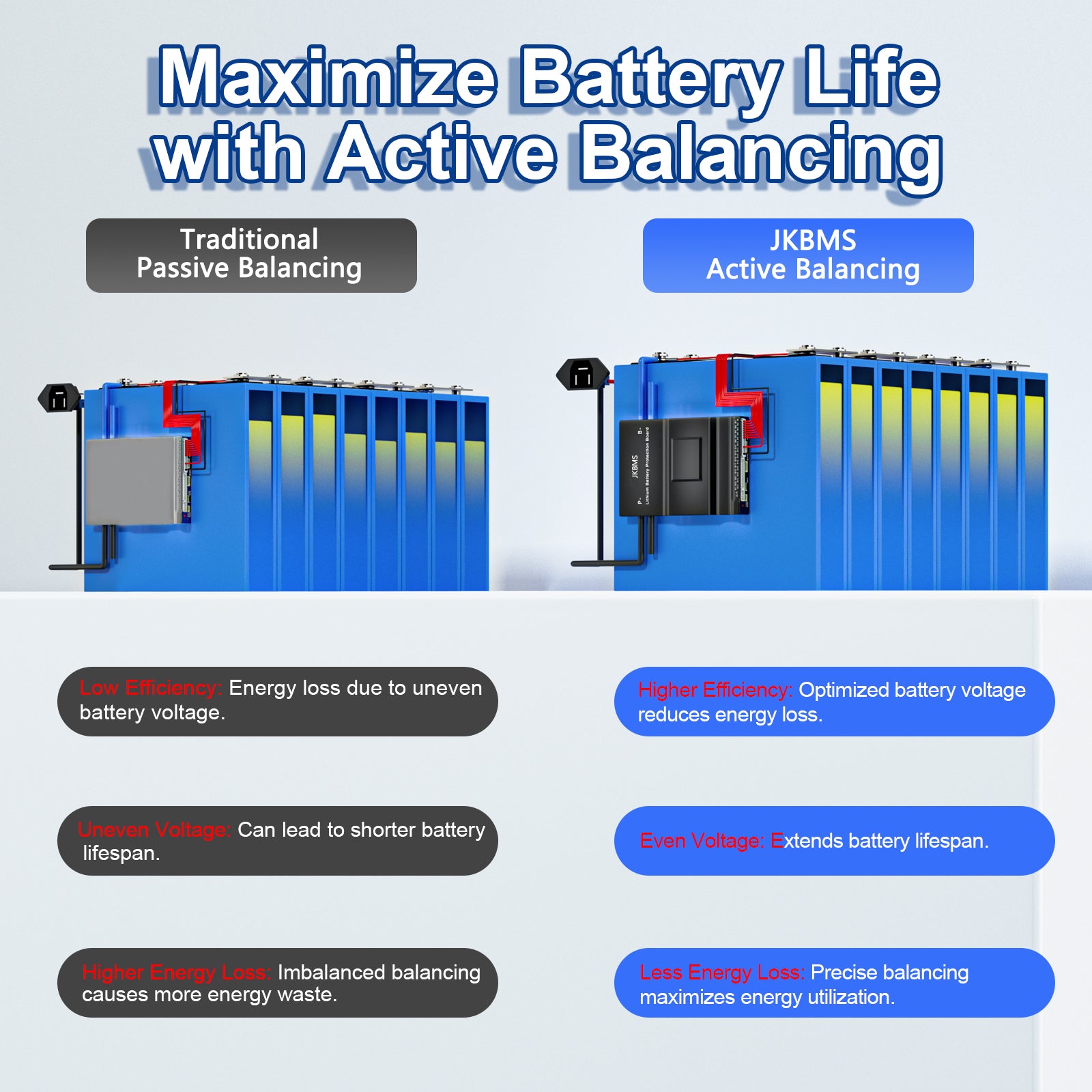JK BMS features high-efficiency active balancing technology that transfers energy between cells to reduce voltage differences.