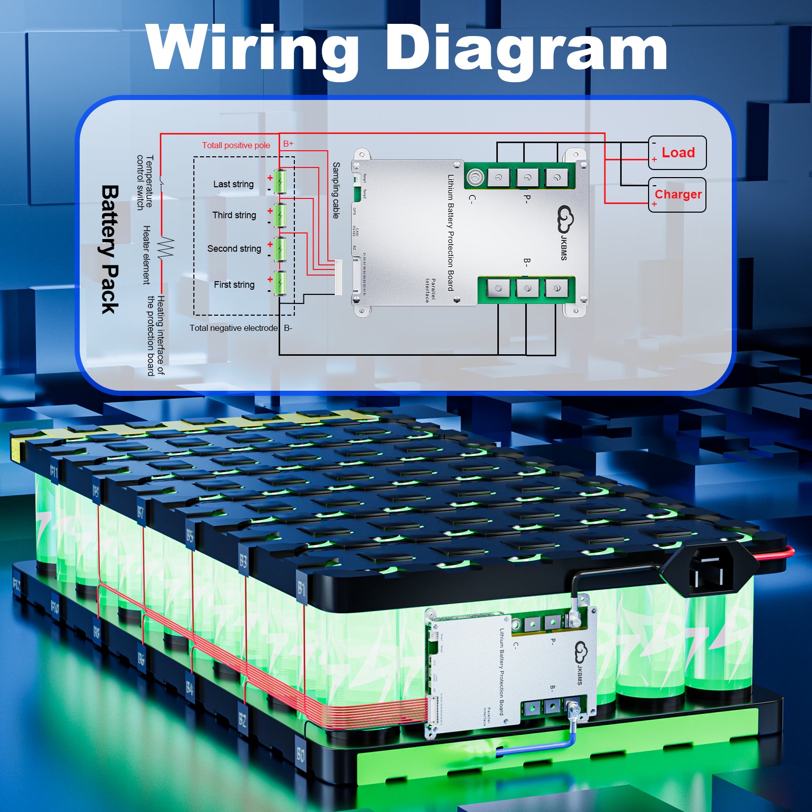 JK BMS continuously monitors battery conditions to ensure safe and stable operation. The system provides multiple protection functions including: